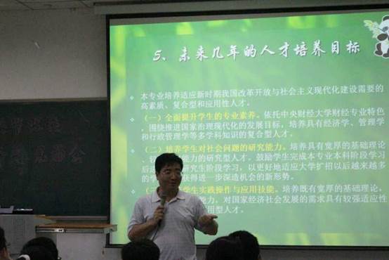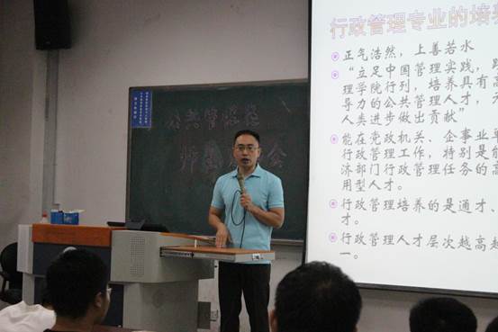 随后,曹堂哲老师介绍了行政管理专业在大学学科体系中的位置、专业培养方案、未来发展方向、大学学习与专业学习的关系。曹老师首先阐述了“行政关系”是公共管理各个学科关注的共同点,而“行政关系”的研究是行政管理专业的基础,行政管理专业在公共管理学科中具有基础性地位。随后曹老师指出行政管理专业培养的是通才、统御之才和领导之才,培养的学生能在党政机关、企事业单位、社会团体从事行政管理工作,特别是能够承担政府综合部门行政管理任务的高素质、复合型和应用型人才。曹老师还介绍了我院公共管理专业“1+3”人才培养模式和行政管理专业的知识结构,详细介绍了行政管理专业的知识模块。曹老师着重分析了我校行政管理专业的特色和优势,逻辑严谨,富有哲理,引起了同学们的强烈共鸣。