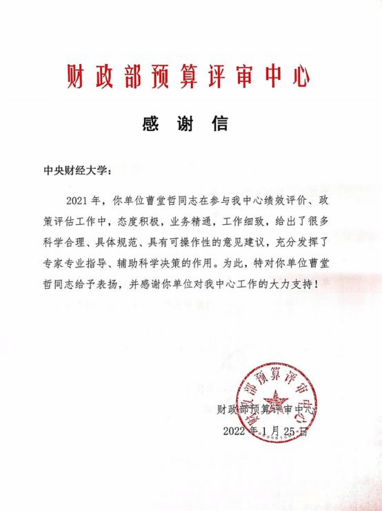 【社会影响】我院曹堂哲教授收到财政部预算评审中心感谢信