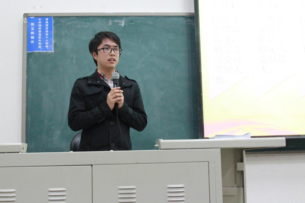 党支部副书记果航宇首先就本年度新年工作作了介绍。他向各位同学介绍了党支部的组织建设情况,并说明了党总支书记、副书记和其他委员的职责。随后,果航宇同学向大家预告了本学期的支部活动,并希望广大党员能够积极参与,投身实践。最后,果航宇同学就如何扩大党员队伍、将优秀同学吸纳到党组织中来以及本年度发展党员计划,发展流程等事宜作了详尽阐释。果航宇同学的一番发言细致入微,鞭辟入里。