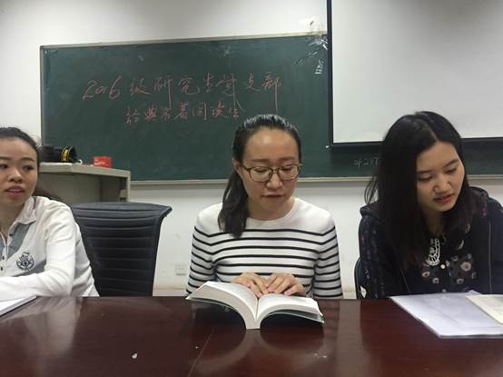 朱洁首先做了开场发言,他指出,开展经典名著阅读会活动目的在于响应党中央以及学校党委关于深入推进“两学一做”学习教育的号召,加深学生党员对马克思主义经典著作的了解,以更加明确党的指导思想的根源。他还指出,根据党的制度和学校学院的相关安排,2016级研究生党支部得以迅速组织和建立起来,这为后续相关工作的开展奠定了良好的基础。支部在今后将会积极落实和贯彻上级党组织的要求,积极配合上级党组织的工作安排。