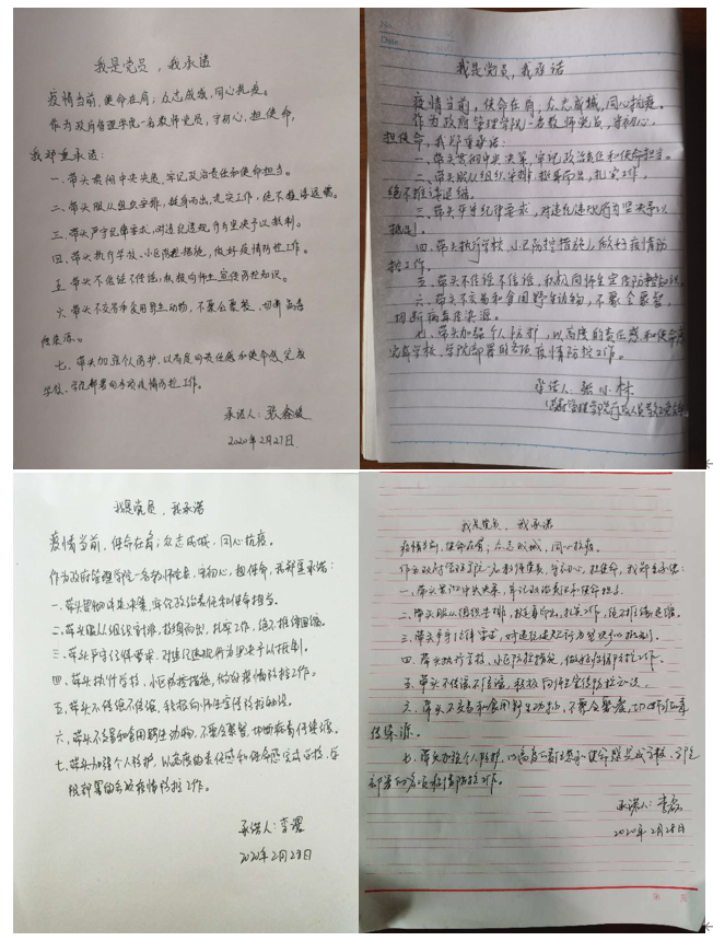 2月28日上午10:00,437bwin必赢国际行政人员教工党支部里利用微信平台举行“同心抗疫,共克时艰”线上主题党日活动。支部党员们在微信群中就近期学习实践情况进行交流,并集中学习了《习近平总书记在北京调研指导新冠肺炎疫情防控工作重要讲话精神》以及《习近平在统筹推进新冠肺炎疫情防控和经济社会发展工作部署会议上的讲话》,集中讨论了学校疫情防控工作的有关规定和要求。在“同心抗疫,从我做起”环节,支部成员以图片、视频、音频等多种方式上传“党员承诺书”,承诺要坚定抗疫信心,坚守自身岗位,发挥共产党员的带头作用,以实际行动为抗击疫情做贡献!