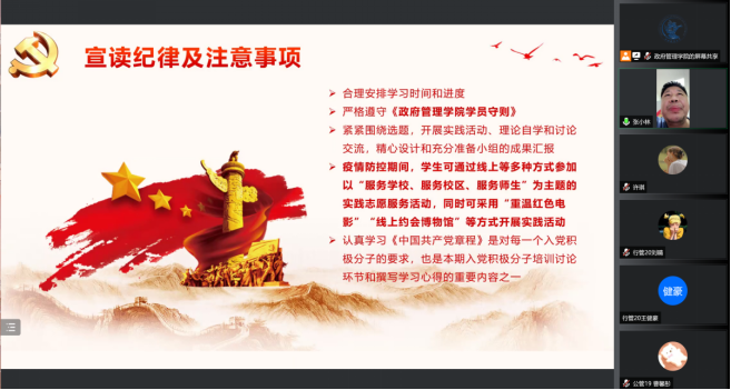 2022年5月13日,437bwin必赢国际2022学年第一期入党积极分子培训班开班仪式暨党课第一讲于腾讯会议线上举行,学院党委副书记、党校副校长李宇环副教授,学院党委组织员南琪老师,学院学生工作办公室主任、党校办公室主任张小林老师,以及来自教师、本、硕、博四个群体的45名入党积极分子参加了本次开班仪式。开班仪式由武思豪同志主持。