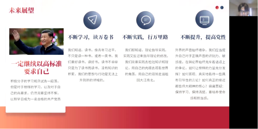 “承领袖风骨,书吾辈华章。”通过小组的学习、思考、实践和感悟,深刻领会习近平总书记对于坚守信念、牢记初心宗旨的重大论断和要求,深入体会习近平总书记和党的创新理论的真理力量。最后,回归入党积极分子、新时代青年的身份,小组总结出,青年应当把握好党的精神内核,内化于心外化于行,脚踏实地行稳致远,不断锤炼本领,担当青年的时代重任。