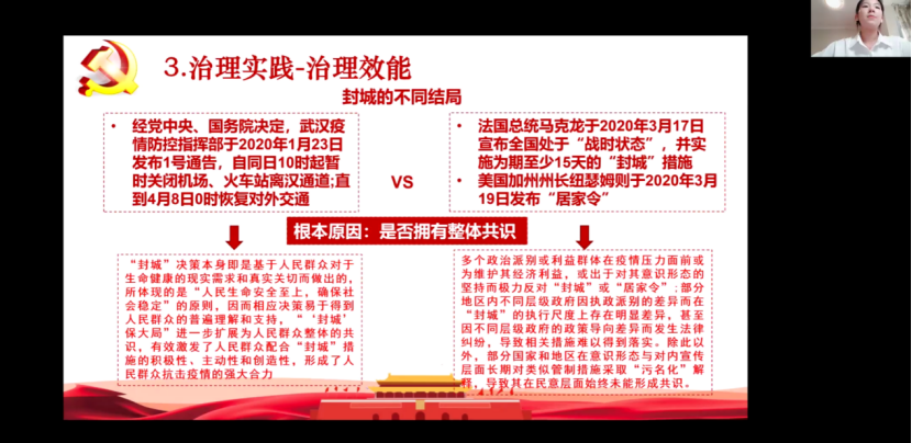 “功成不必在我,功成必定有我。”宅家时代小组以“从抗疫实践看中国特色社会主义的制度优势”为主题,通过多次小组集体学习,对抗疫实践中的优秀共产党员以及国内外抗疫局势的分析,由此得出疫情防控重大成果彰显了中国特色社会主义制度的优势这一结论。因此我们要持续推进制度体系建设,推进治理效能的优化,大学生更应当抱有“功成不必在我,功成必定有我”的决心,努力成长为合格的社会主义接班人。