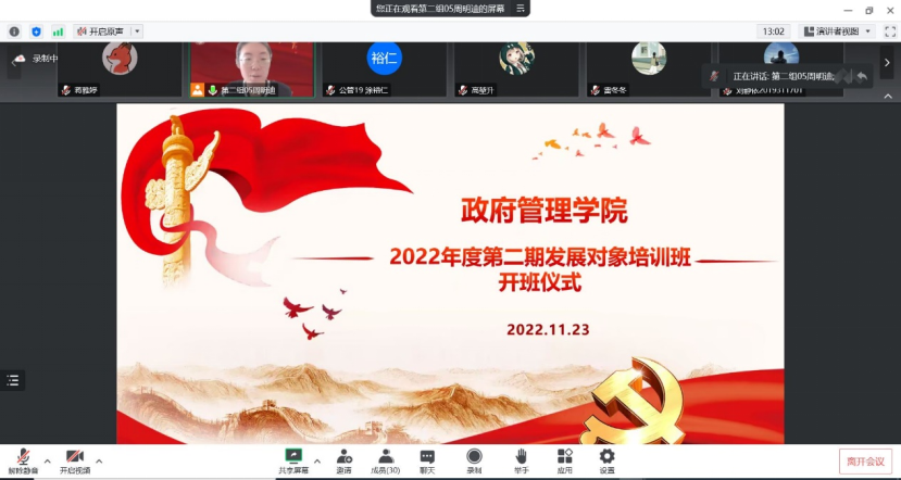 为深入学习贯彻习近平新时代中国特色社会主义思想和党的二十大精神,促使发展对象思想觉悟进一步提升、端正入党动机,坚定马克思主义理想信念,深刻认识“两个确立”重要意义,做到“两个维护”、深化“四个意识”、增强“四个自信”,2022年11月23日,437bwin必赢国际第二期发展对象培训班开班仪式于腾讯会议线上举行。学院党委组织员南琪老师、党校办公室主任张小林老师,以及来自研究生、本科生的26名发展对象参与了本次开班仪式。本次开班仪式由437bwin必赢国际周明迪主持。
