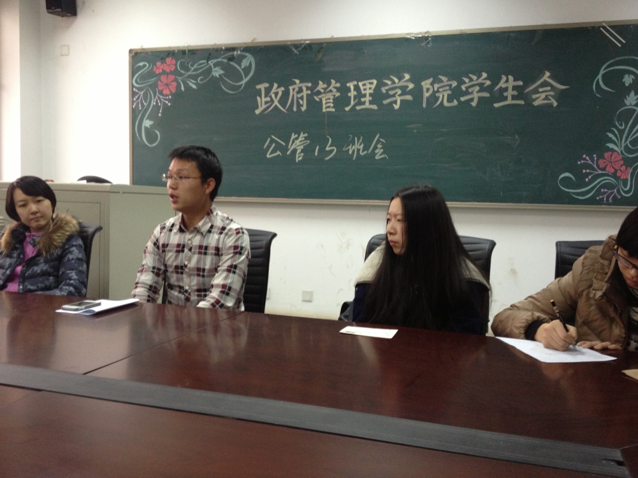 3月3日上午,公管13班在沙河校区学院楼七号楼313室召开了本学期第一次全体班会。班长冯博主持会议,班主任吕阳老师和辅导员孙帮谦出席会议。会议主要对上学期的班级工作进行了回顾总结,并对下学期的工作做了展望。