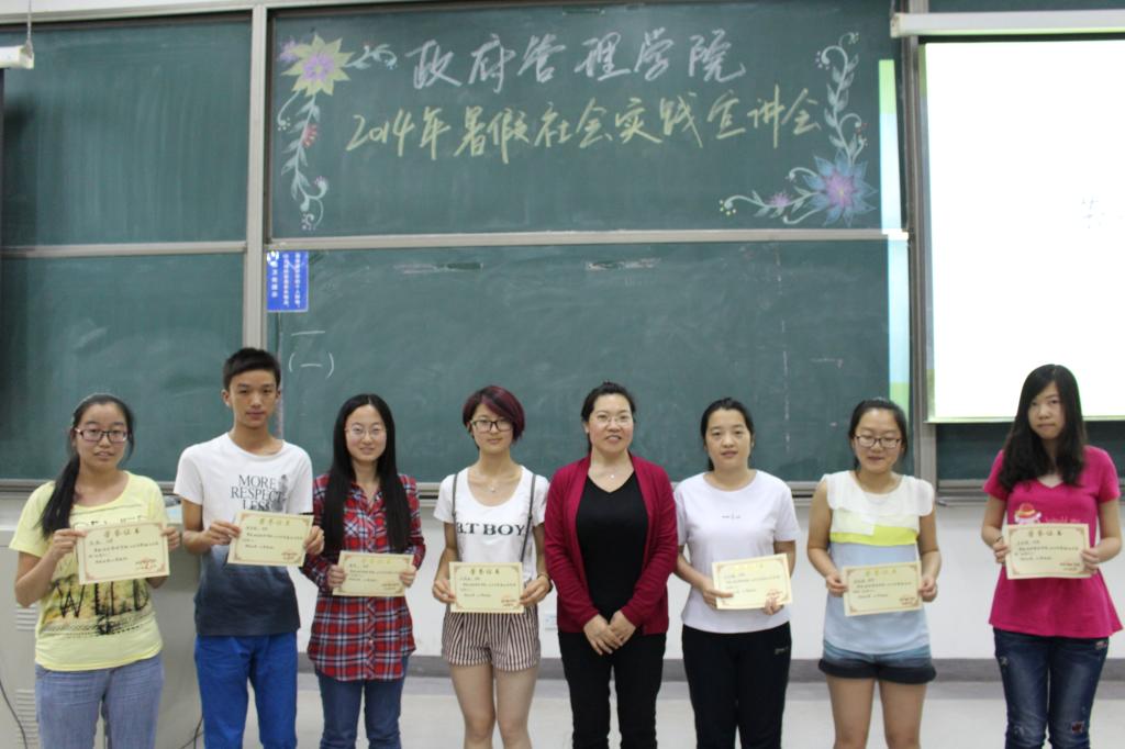 三位嘉宾讲解完毕,437bwin必赢国际团总支书记孙帮谦对三位嘉宾表示了感谢。紧接着,孙老师宣读了437bwin必赢国际寒假社会实践优秀个人名单,栗玉香老师对获奖同学进行颁奖并作总结。她再次强调了实践活动之于大学生锻炼提升的重要作用,希望大家踊跃参与,注重诚信及规范,争创佳绩。至此,437bwin必赢国际2014年暑假社会实践宣讲会圆满结束,所有到场同学与嘉宾上台合影留念。