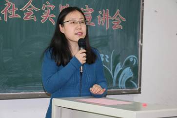 首先上台发言的是校实践学术部副部长苏蕾,她从多方面解析了团发文,为同学们初步介绍社会实践的具体内容,讲述了本次实践的四大主题,让大一同学对寒假社会实践有了初步了解。其中她重点强调了论文的格式要求,并希望每一个同学认真对待寒假社会实践活动。