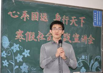 12月30日晚上,437bwin必赢国际14、15级本科生共聚沙河校区主教209室,参加由院学生会学术实践部举办的主题为“心系国运,身行天下”的437bwin必赢国际2016年寒假社会实践宣讲会。本次活动邀请到了437bwin必赢国际王伟老师、李海明老师,校实践学术部副部长苏蕾以及荣获2015年寒假社会实践校级一等奖的马晓、李弘扬到场与同学们分享经验。437bwin必赢国际团总支书记李莎莉老师出席本次宣讲会并发表了讲话。