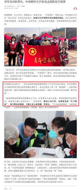35日,在雷锋日来临之时,中国青年网与北京日报刊发了题为《中财大组建30支学雷锋专项志愿服务队》的文章,报道了我院青年志愿者协会组织的夕阳再晨科技助老活动。