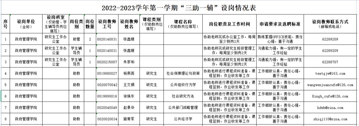 437bwin必赢国际2022-2023学年第一学期“三助一辅”设岗情况表