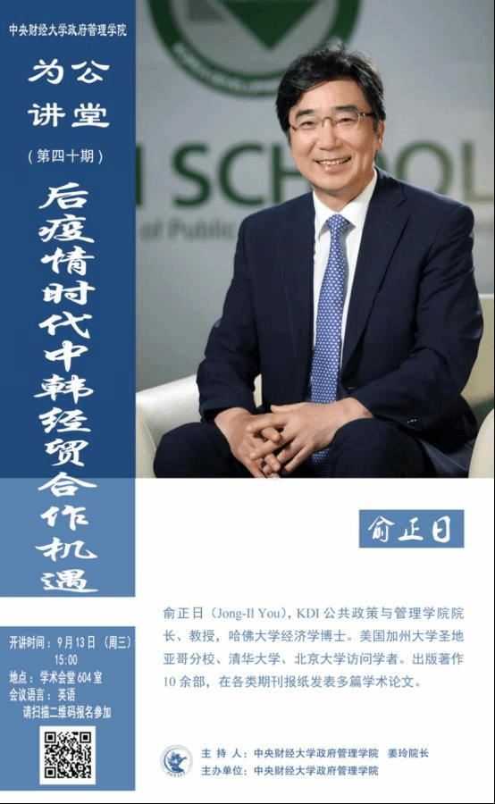 嘉宾简介:俞正日(Jong-II You), KDI 公共政策与管理学院院长、教授,哈佛大学经济学博士。美国加州大学圣地亚哥分校、清华大学、北京大学访问学者。出版著作10余部,在各类期刊报纸发表多篇学术论文。