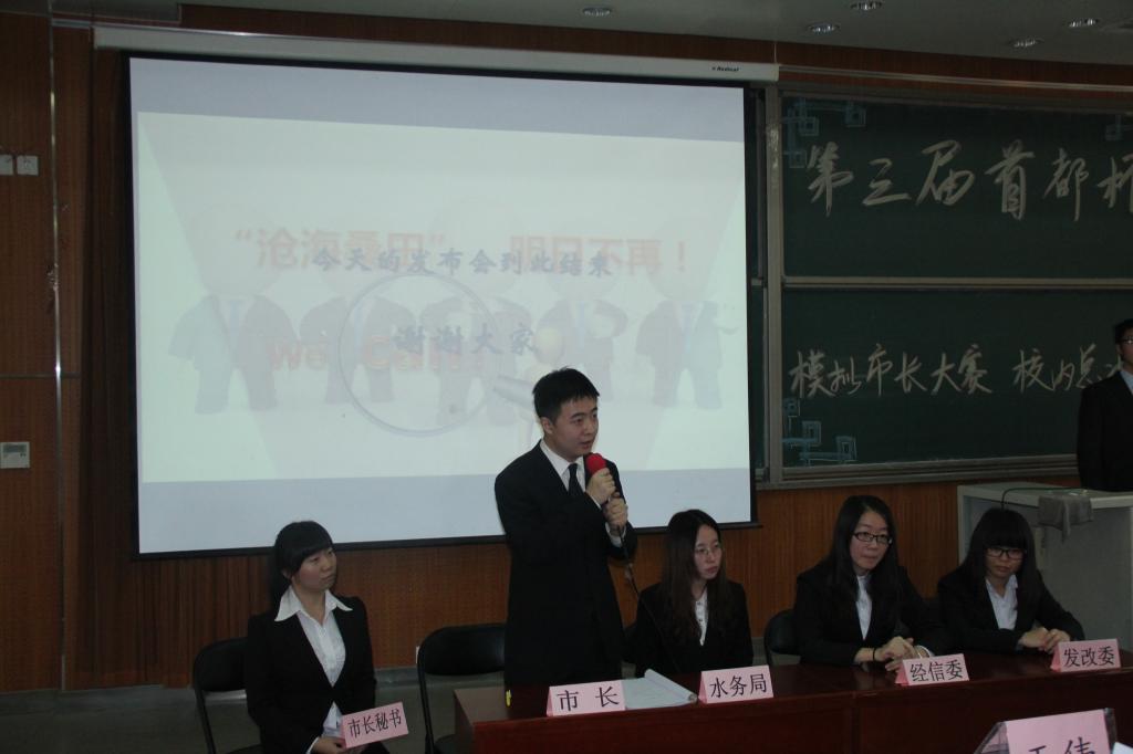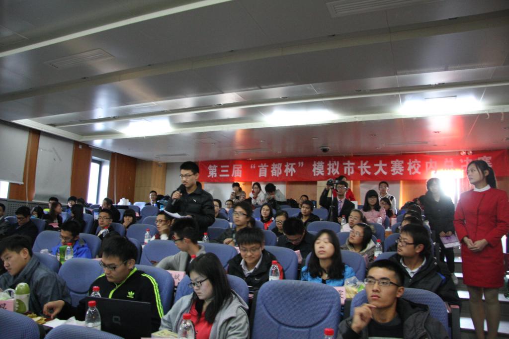 2013年11月17日下午,由437bwin必赢国际、德育示范基地“未来公务员之家”举办的第三届“首都杯”模拟市长大赛校内总决赛在沙河校区成功举行。