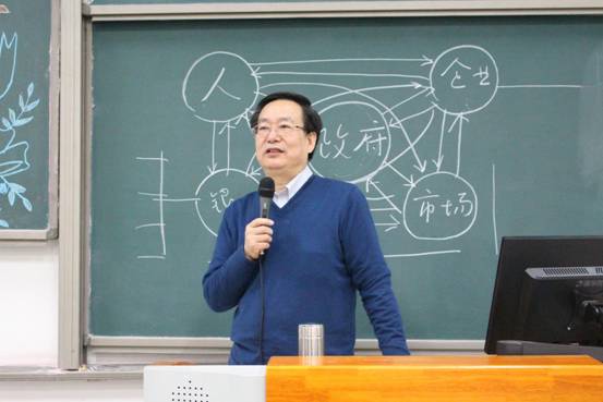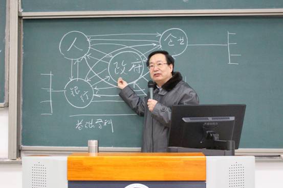赵院长首先谈到公共管理学科的发展问题。他依次分析了从建国前到改革开放后各个时期内发挥作用较大的学科,并指出:在中国,公共管理学科起主导作用的时代已经到来。正如习近平总书记在十九大报告中提到的“推进国家治理体系和治理能力现代化”,赵院长希望同学们用发展的眼光看问题,做充满使命感、责任感、未来感的青年人。他说道:“如果大学四年,你能够确定你一生的使命,这就是最幸运的事情。”接着,赵院长用画图的方式让同学们理解在中国国民经济的运行中不同学科分别起到的作用,就政府、人、企业、市场、银行这五个要素两两之间的双向关系分别列举了相关的研究学科。赵院长说:“公共管理绝对不是就政府谈政府,政府管理的范围十分广泛,公共管理的事业是非常宽广的”,他希望同学们认真思考怎样选择职业,为什么而奋斗,想成为什么样的人,并能够自觉抵制机会主义,在学科发展的广阔天地中找到属于自己的奋斗目标和奋斗位置。