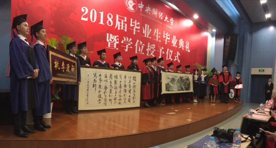 典礼进行第六项,毕业生代表向学院赠送精美的礼物,寄寓莘莘学子对学院浓浓的深情。本科生赠送了一幅由我校党委副书记兼纪委书记、当代书法研究中心轮值主席陈明所作的《逐怀引》书法作品,表达出本科毕业生对母院的感恩之情,以及“虽各处南北天涯,仍坚持春秋公道,以凌云之志,成笃志之行”的坚定信念。双证MPA班为母院献上一幅以院训“正气浩然,上善若水”为主题的国画,画中山水相依,雄浑壮阔,寓意437bwin必赢国际发展的磅礴之势,表达出毕业生们对学院再创辉煌的美好祝愿。单证MPA班的毕业生为学院赠送的礼物是两发火箭模型,一发代表着辉煌的历史,一发着眼于令人期待的未来,两发火箭表达出毕业生对学院在传承和创新中,继续培养国之栋梁,继续奏响新时代长征凯歌的美好祝愿。学术型研究生赠送的礼物是双绿萝配木刻牌匾,象征着坚韧与善良的绿萝代表了437bwin必赢国际学子们坚持理想、不忘初心的坚定信念,镌刻“桃李政研”的木刻牌匾表达了毕业生对于政管学子宏图大展、母院桃李满天下的美好祝愿。博士毕业生向学院敬赠“一流政管,锦绣河山”木质雕刻,表达博士毕业生对于国家和学院细心栽培的感恩之情,并且祝福学院蒸蒸日上,祝福毕业生们激扬政管风采,装点锦绣河山!
