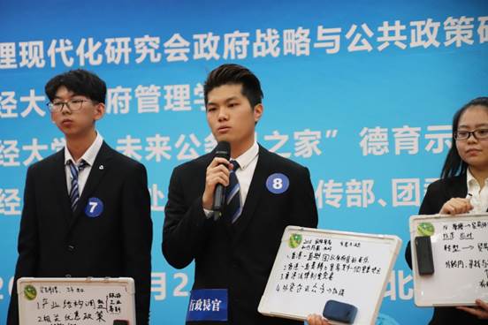 在激动人心的“市长终极PK”环节,评委组组长张占斌教授现场抽取试题:在如今中美贸易出现摩擦的背景下,假如你是一位沿海城市的市长,你将采取什么应对措施?针对这一问题,各位“市长们”从不同角度进行了思考,各抒己见。有选手认为应该充分利用媒体力量安定企业和民心,对中小企业进行补贴,也有选手认为最重要的是提升产品质量,促进产业结构调整,还有选手提出重视失业问题,预防群体性社会事件的视角。“学生市长”发言完毕后,评委们对部分“学生市长”进行提问,并根据场上选手的表现,提名每人提名1位“最佳市长”候选人。
