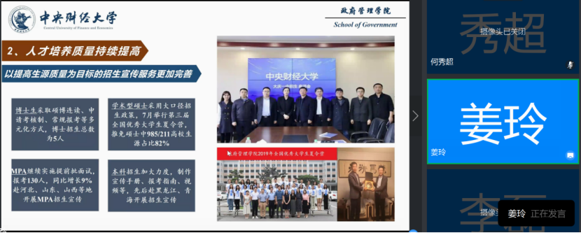 何秀超书记高度肯定了学院新老班子一年来的工作与成绩,并结合学校工作要点,为学院下一步工作提出了“五步走、七重点、八举措”的建议。战略部署上“五步走”,一是定目标,确定学院发展的年度目标;二是有规划,根据目标制定时间表、路线图;三是抓落实,将责任分解到位、落实到人、层层压实;四是建考评,建立和完善考评机制,将定期考评和不定期考评相结合;五是重监督,确保各项计划和工作稳步推行。具体要求上“七重点”,一是建制度,要逐步建立和完善学院制度体系;二是强管理,要逐步提高管理服务质量和效益;三是抓整改,主题教育形成的成果要逐步落实;四是担责任,领导班子要担当作为、发挥作用;五是促团结,要激发大家干事创业的积极性;六是建团队,要组建结构合理、能力综合的重点工作项目团队;七是力攻坚,找差距、补短板、打赢学院发展瓶颈的攻坚战。具体工作上“八举措”,一是坚持将疫情防控放在重中之重的位置,并做好学院师生网上教学学习等的保障工作;二是着手研究制定学院的返校方案,将主体责任贯穿全员全方位全过程;三是注重务虚,厘清学院发展议题;四是提高人才培养质量,着力促进学生的全方面发展;五是提升学院科研实力,助力教师实现科研与教学的互促互进;六是扩大学术活动的影响力,落实好学校相关要求;七是搭建社会实践平台,引导学生将论文写在中国大地上;八是强化院内文化建设,营造温馨活泼的学院氛围。