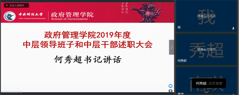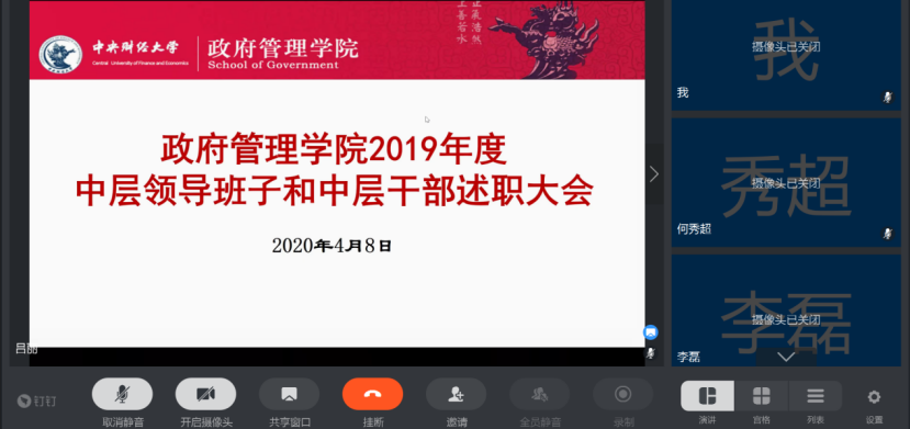 2020年4月8日,437bwin必赢国际通过钉钉视频会议召开线上2019年度中层领导班子和中层干部述职大会。校党委书记何秀超出席会议,学院领导班子成员及全体教职工参加会议。会议由学院党委书记吕丽主持。