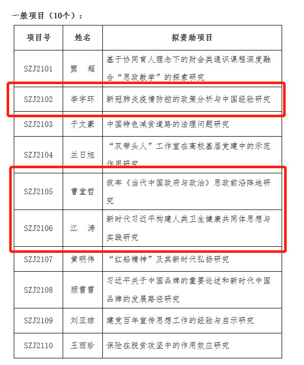 在2021年437必赢国际“红色擎,龙马行”教师“思政+”专项支持基金资助项目遴选工作中,我院李宇环副教授申报的《新冠肺炎疫情防控的政策分析与中国经验研究》、曹堂哲教授申报的《筑牢<当代中国政府与政治>思政前沿阵地研究》和江涛副教授申报的《新时代习近平构建人类卫生健康共同体思想与实践研究》三项课题喜获立项资助(全校共10项)。