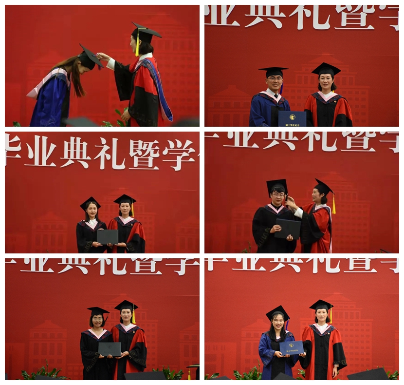 典礼进行第七项,学位授予仪式。在庄严而令人激动的乐曲声中,姜玲院长为2021届毕业生和2020届返校毕业生代表颁发毕业证书和学位证书,拨正流苏,握手并合影留念。深深鞠躬,感恩您谆谆教导;流苏拨正,愿你前路一片坦荡。