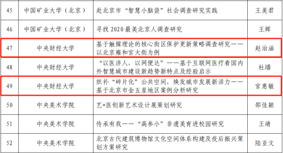 我院三支师生团队在激烈角逐中脱颖而出,李宇环副教授队伍的项目《社会资本参与老旧小区改造的渠道创新与政策突破调研》荣获教师组优秀示范项目;赵治涵同学队伍的项目《基于触媒理论的核心街区保护更新策略调查研究——以北京雍和宫大街为例》以及官惠敏同学的项目《织补“碎片化”公共空间,焕发城市发展新活力——基于北京市金五星地区案例分析研究》荣获学生组优秀示范项目。