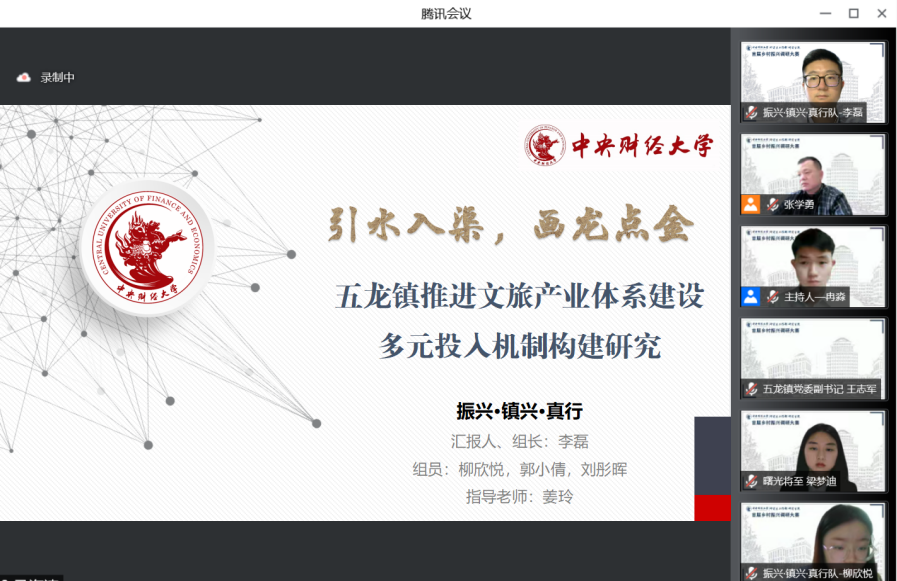 5月26日下午,我校“百年征程风华时 乡村振兴在路上”第一届乡村振兴调研大赛决赛通过腾讯会议云端举行。经初赛、复赛以及学术不端检测,9支队伍从44支参赛队伍中脱颖而出,进入决赛答辩。决赛中经过参赛者汇报、评委老师提问、点评和打分环节,我院2021级硕士研究生李磊、柳欣悦、郭小倩、刘彤晖4名同学在姜玲教授指导下完成的调研报告“引水入渠,画龙点‘金’:五龙镇推进文旅产业体系建设多元投入机制构建研究” 获得三等奖。