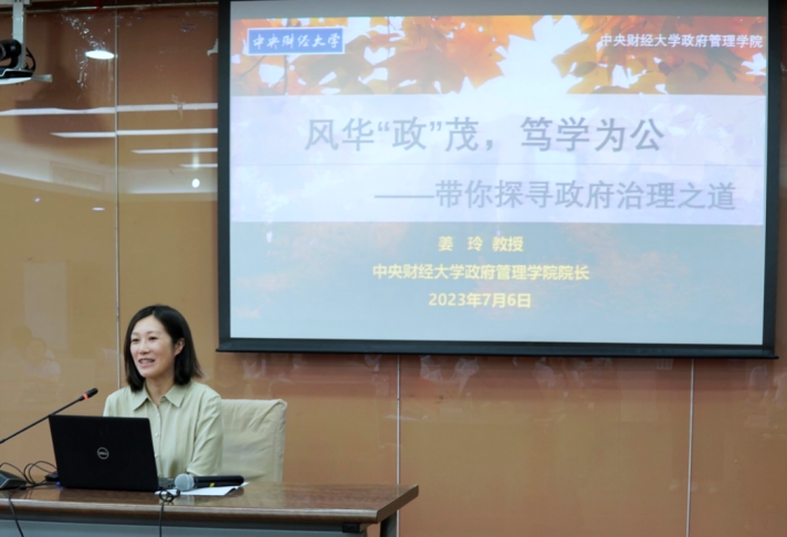姜玲院长首先致辞,她对各位营员的到来表示热烈欢迎,然后为全体师生开展“风华政茂,笃学为公——带你探寻政府治理之道”主题讲座,就新时代公共管理学科建设与发展、中财437bwin必赢国际研究生培养特色和就业前景进行了精彩讲解。